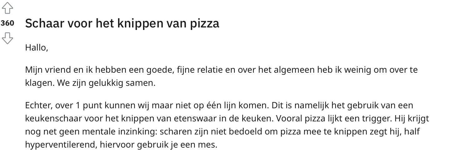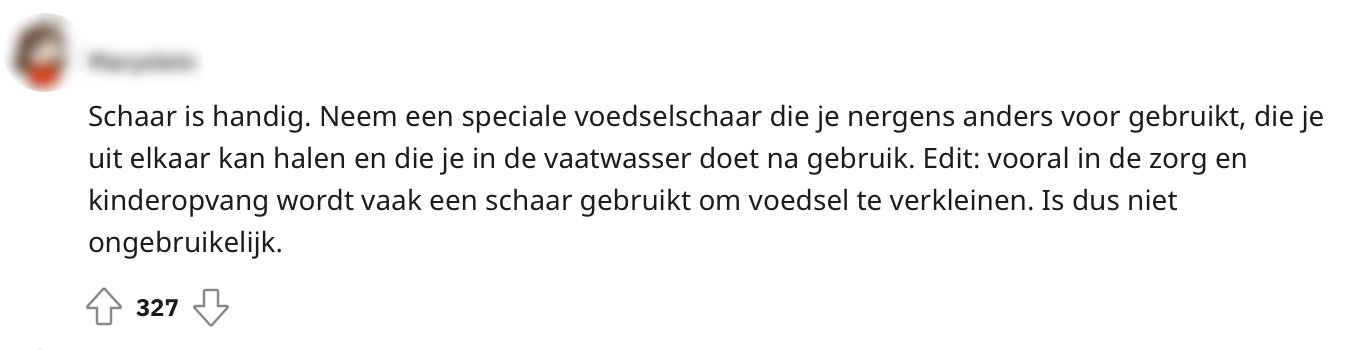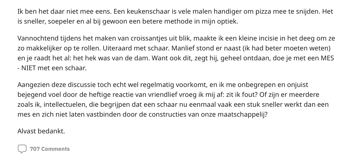 Iedereen heeft zo z’n eigen eet- en kookgewoontes. Maar waar de meeste mensen het wél over eens zijn, is dat je eten met een mes snijdt. Toch houdt lang niet iedereen zich aan deze ongeschreven regel. Een Reddit-gebruiker pakt liever de schaar erbij wanneer er iets in stukken moet worden gehakt en deelt dit discussiepunt online. Eén ding is zeker: de spanning in de reacties is om te snijden…