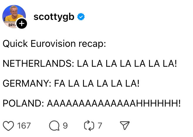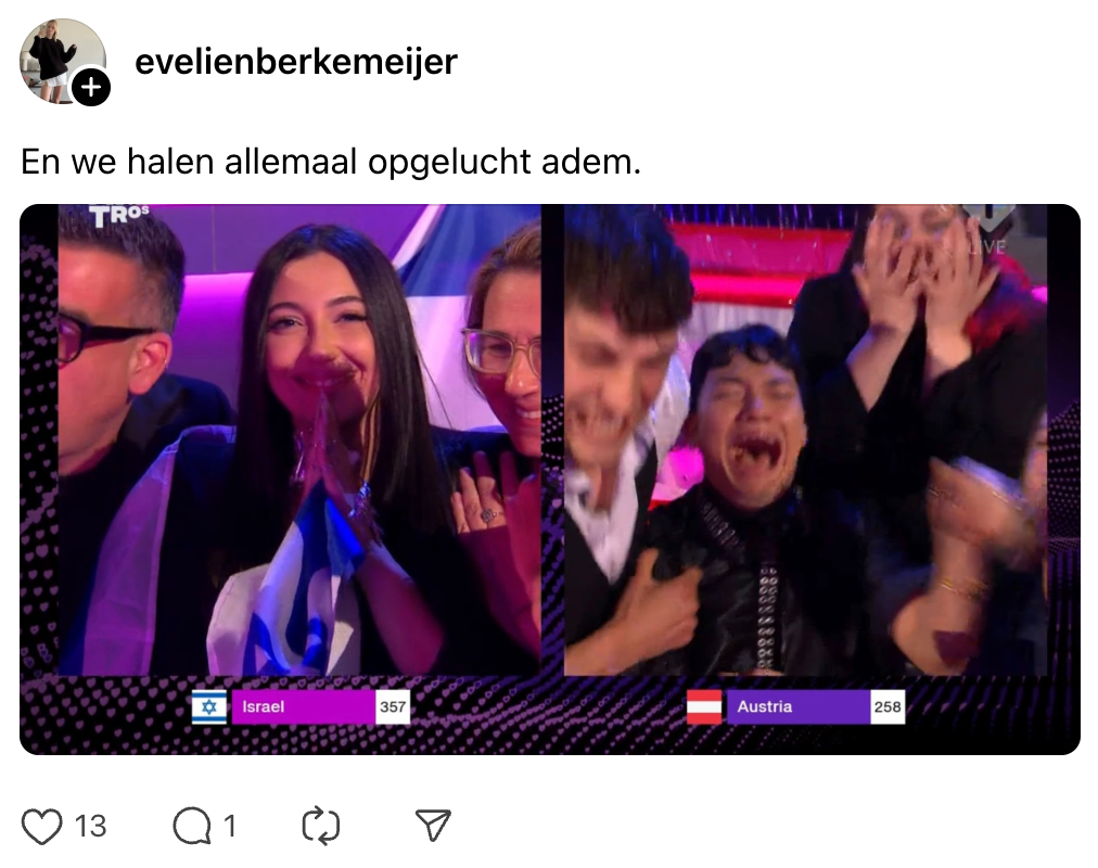 Dat was ‘m dan: de finale van de 69e editie van het Eurovisie Songfestival. Net zoals vorig jaar was het een beladen editie, want er was veel kritiek op de deelname van Israël. Onze eigen Claude mocht als twaalfde het podium betreden, maar dat bleek helaas geen voorbode voor veel ‘douze points’ van Europese landen of het publiek. Natuurlijk werd social media weer gebruikt als uitlaatklep voor alle kritiek, om het optreden van Claude te bespreken én de shows van zijn concurrenten te beoordelen. En dat hebben wij effe overzichtelijk voor je op een rijtje gezet.
