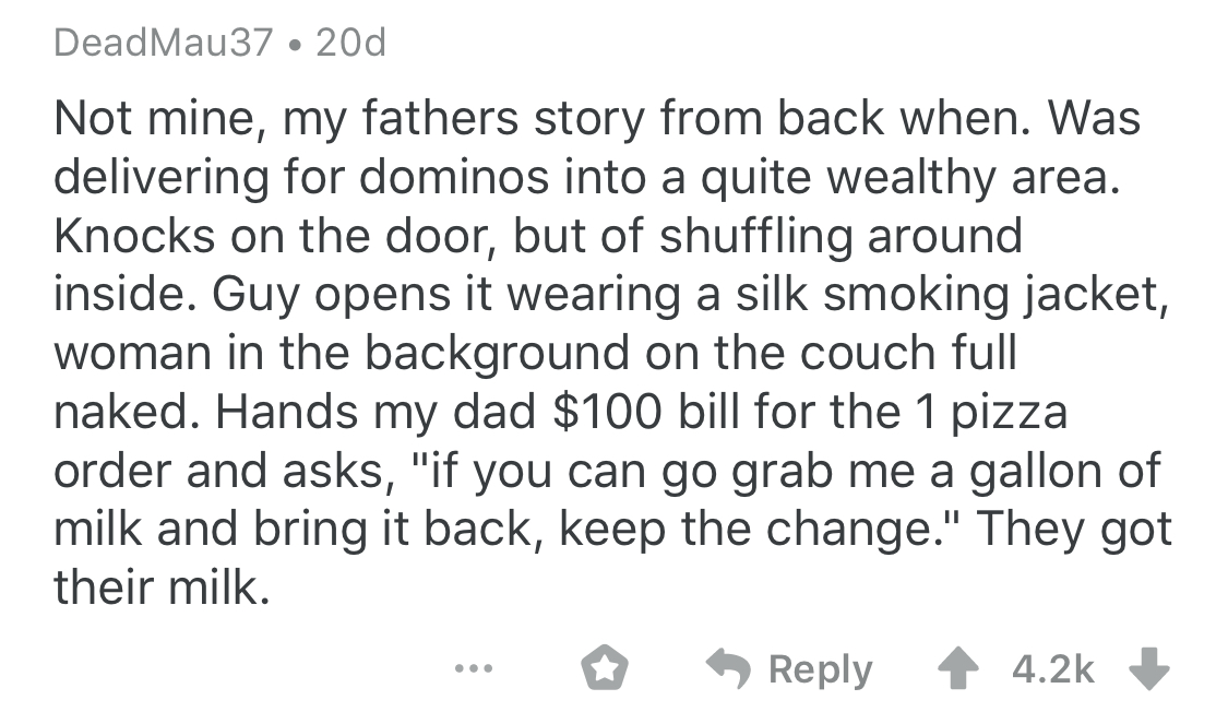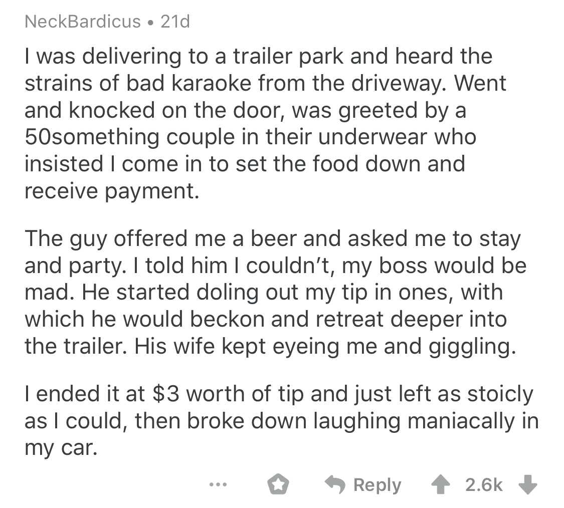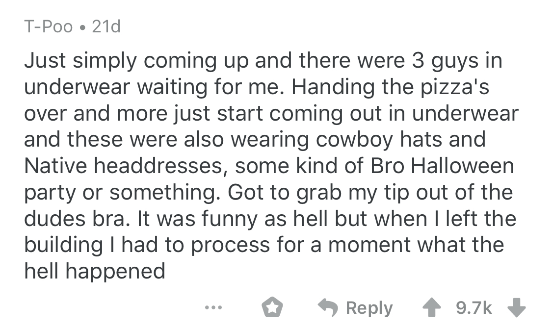 1. Gebruiker messydavidd vroeg de Reddit-gemeenschap welke bizarre ervaringen pizzabezorgers meemaken tijdens hun werk.