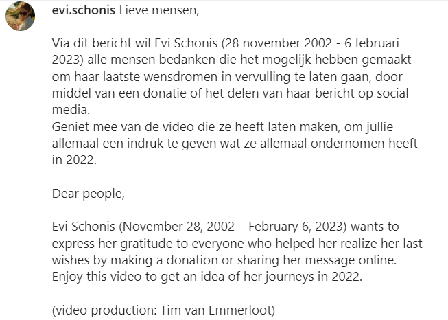Evi Schonis (20) werd op haar veertiende al gediagnosticeerd met botkanker en heeft gaandeweg veel obstakels moeten overwinnen. Na chemotherapie en de zware revalidatie hiervan wist ze toch haar Havo-diploma te halen en startte ze zelfs een studie op het HBO. Maar toen Evi te horen kreeg dat ze weer uitzaaiingen had, besloot ze deze keer te kiezen voor kwaliteit van leven, wat voor haar het maken van een wereldreis betekende. Na een geslaagde geldinzameling om haar laatste wens in vervulling te laten gaan, is Evi’s laatste reis gisteren op haar Instagram-account verschenen.
