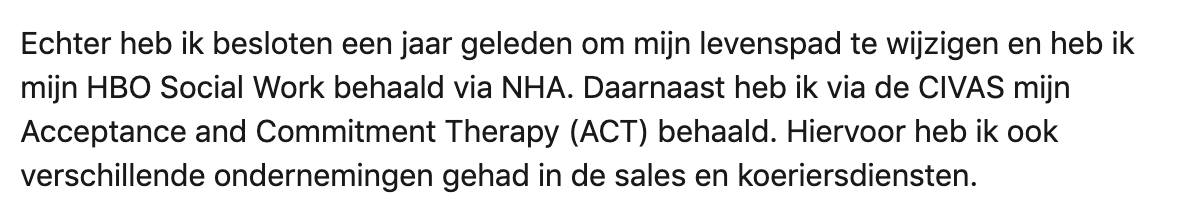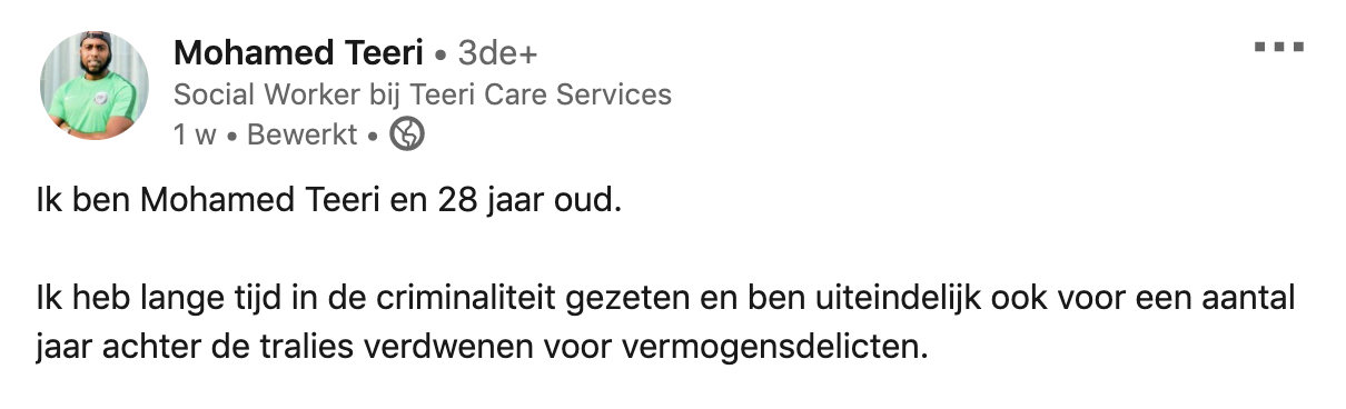 Soms maken mensen bepaalde keuzes in het leven, om er later achter te komen dat ze hun leven met 180 graden willen omgooien. Zo ook Mohamed Teeri. Hij zat lange tijd in de criminaliteit, maar wil nu iets goeds doen met zijn leven. Hij deelt zijn verhaal op LinkedIn.