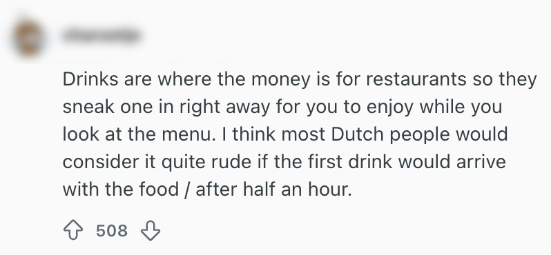 Zodra je neerploft op een stoel in een restaurant, is het een kwestie van seconden voordat het personeel naast je staat met die ene vraag: ‘Kan ik wat voor je inschenken?’ Aangezien je dit al van mijlenver ziet aankomen, heb je onderweg bedacht of je zin hebt in een frisje, een glas wijn of een halve liter bier. Toch is dit niet voor iedereen vanzelfsprekend. Een expat raakt overrompeld door het tempo waarin Nederlandse horecamedewerkers de eerste bestelling opnemen en vraagt zich hardop af hoe Nederlanders hiermee omgaan.