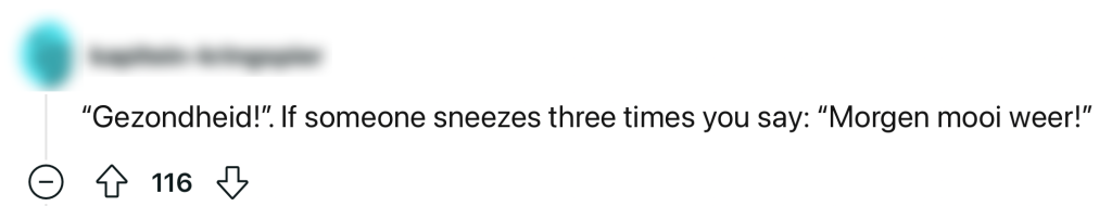 Waar de één met een strak gezicht en zonder zonnebril recht in de zon kan kijken zonder te niezen, zit de ander zonder aanleiding het hele kantoor bij elkaar te blaffen als een verkouden zeehond. Gelukkig hoef je je daar nooit voor te schamen en volgt er in de meeste gevallen een goedbedoelde ‘gezondheid’. Aangezien dit in andere talen net effe anders gezegd wordt, vraagt deze redditor zich af wat Nederlanders zeggen als iemand niest. En dat zorgt voor een hoop sarcastische antwoorden…