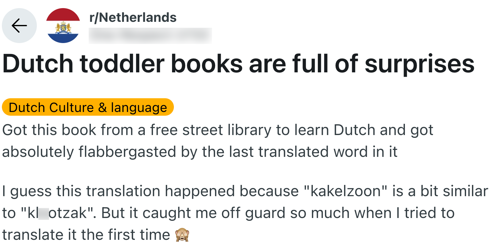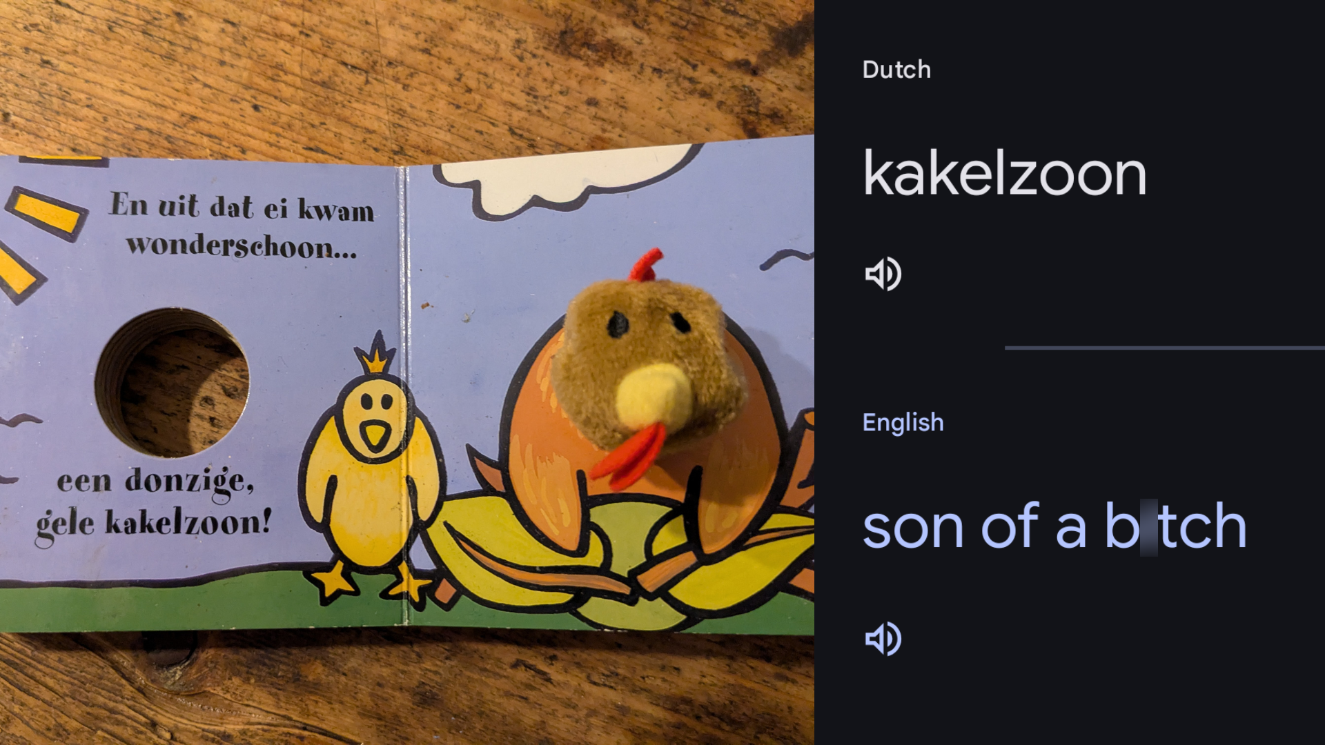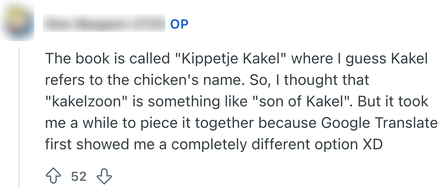 Een goede manier om een taal te leren, is door boeken te lezen. Je vergroot niet alleen je woordenschat, maar leert ook hoe zinnen in de praktijk gebruikt worden. Deze expat wil Nederlands leren en besluit te beginnen met een makkelijk kinderboek. Eén woord uit het boek roept veel vraagtekens op, dus vertaalt de expat het via Google Translate. Maar over de vertaling die daaruit rolt, moet-ie effe z’n ei kwijt. Gelukkig zijn anderen er als de kippen bij om de vertaling uit te leggen.