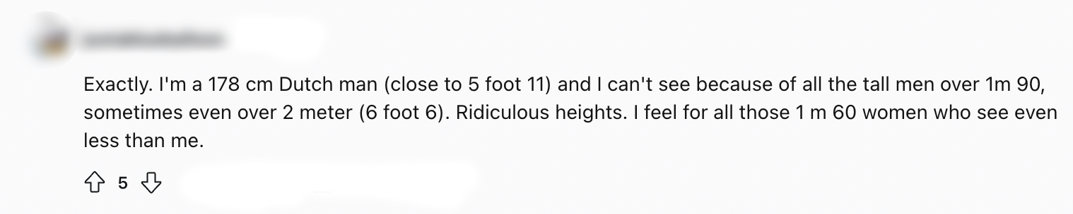 Als mensen uit het buitenland aan Nederland denken, denken ze vaak aan kaas, klompen en natuurlijk aan lange mensen. Dat laatste is heel fijn voor de lange personen in kwestie: ze kunnen overal bij en hebben bij een concert automatisch de beste plek. Helaas betekent dat wel dat iedereen die achter de lange persoon staat, automatisch de allerslechtste plek heeft. En dat is vooral voor expats een nogal onverwachte ervaring.