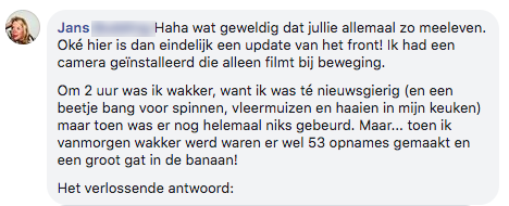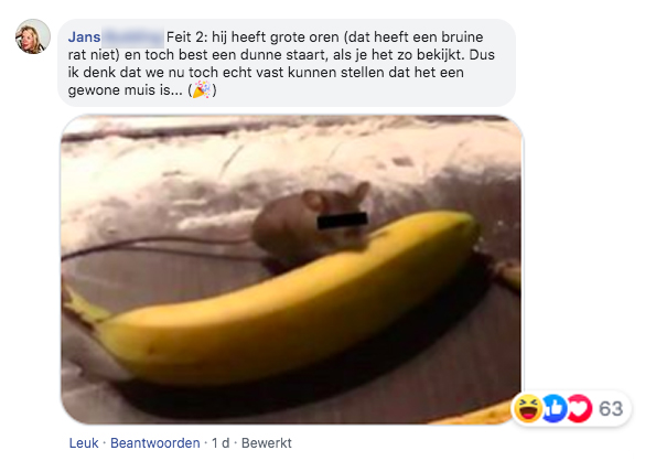 Vledder en de Cock eat your heart out. There’s a new kid in town en haar naam is Jans. Jans zat met een vraag: haar bananen werden continu aangevreten. Muizen, zou je denken, maar er was in geen velden of wegen een keutel te bekennen. Dus gooide ze haar vraag op Facebook. Het resultaat: een bloedstollend spannende zoektocht naar deze bananendief. Én een heterdaadje.