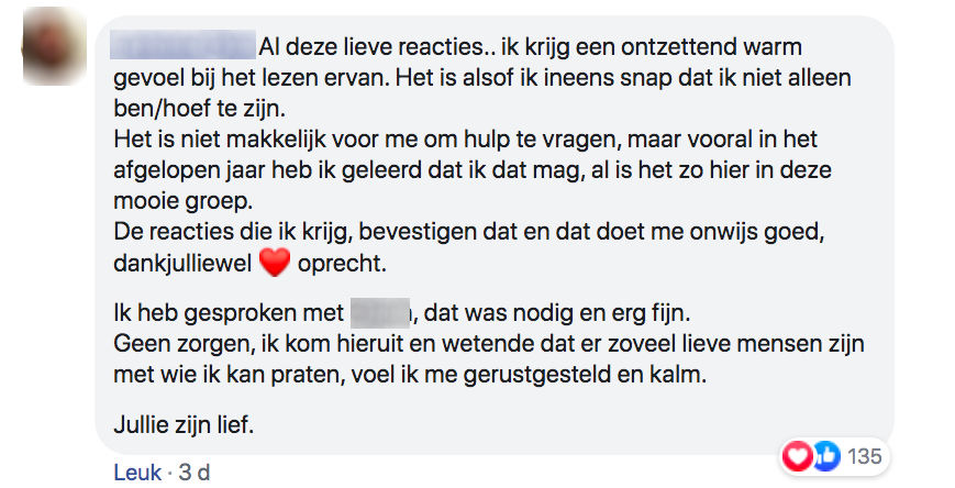 Soms heb je even een mindere dag en dan is het wel fijn als je even met iemand kan praten. Helaas heeft niet iedereen altijd direct iemand bij de hand waar je je verhaal bij kwijt kan. Deze vrouw zocht midden in de nacht een gesprekspartner en besloot het daarom in een Facebookgroep te gooien. En gelukkig kreeg ze heel veel respons.