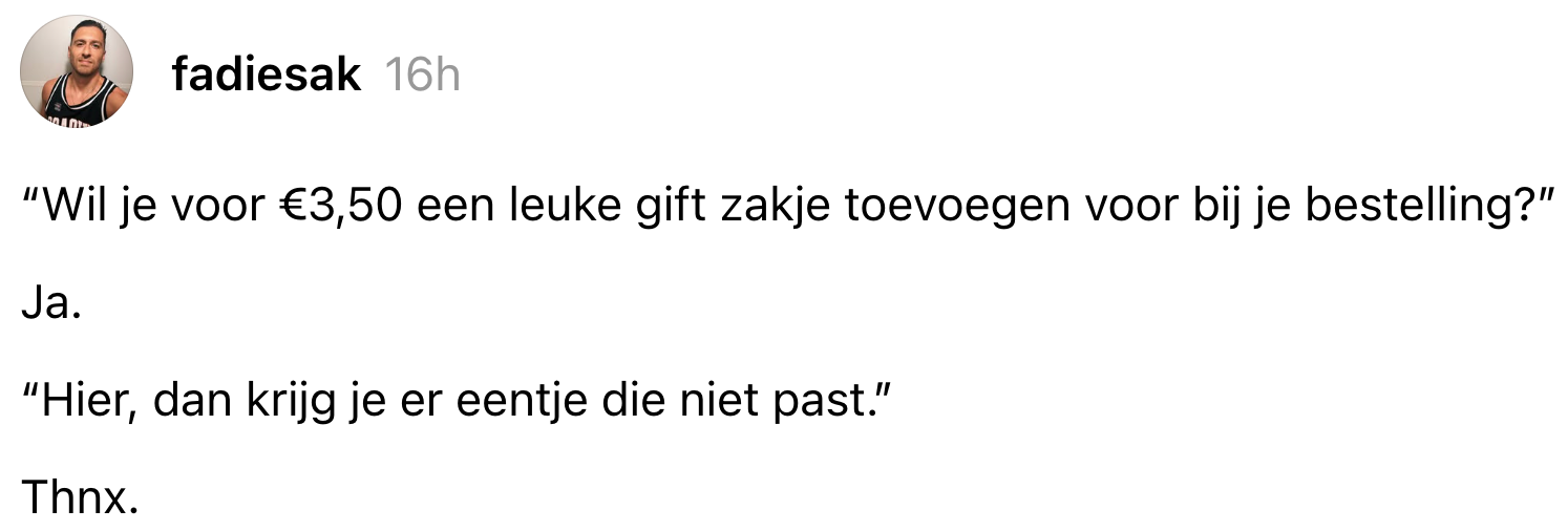 Bij veel webshops kun je, vaak tegen betaling, je bestelling laten inpakken in een mooie cadeauverpakking. Of je nou jezelf effe in de watten wil leggen of de ontvanger van jouw cadeau gewoon niet wil lastigvallen met jouw kleuterachtige inpakskills: iedereen heeft zo z’n redenen om gebruik te maken van deze service. Fadi wilde zijn bestelling ook laten inpakken door een webshop, maar kwam al snel van een koude kermis thuis.