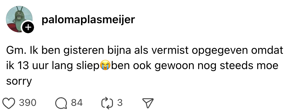 Je telefoon is inmiddels een verlengstuk van je hand geworden. Waar jij gaat, gaat je telefoon. Of je nou trots een perfect gekrulde drol wilt vereeuwigen, onder narcose bang bent een mail te missen of zelfs onder de douche snel dat ene appje wil lezen: zonder dat ding voel je je leeg. Reageren doen we meestal binnen een split second. Je kunt je dan ook voorstellen dat de familie en vrienden van Paloma volledig in paniek raken wanneer ze dertien uur lang niets van zich laat horen. Eén ding is zeker: dit debacle zorgt voor een hoop slapeloze nachten…