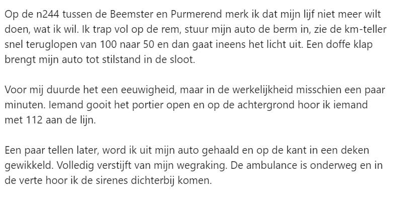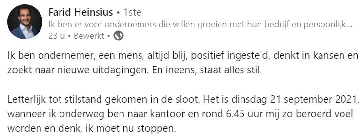Het leven van de altijd zo energieke ondernemer Farid komt met een klap tot stilstand. Letterlijk. Hij belandt met zijn auto in de sloot als zijn brein even besluit uit te checken tijdens het rijden. Zijn leven werd te druk, zijn hoofd te vol. Op LinkedIn deelt hij zijn aangrijpende verhaal en geeft daarmee een levensles door aan anderen.