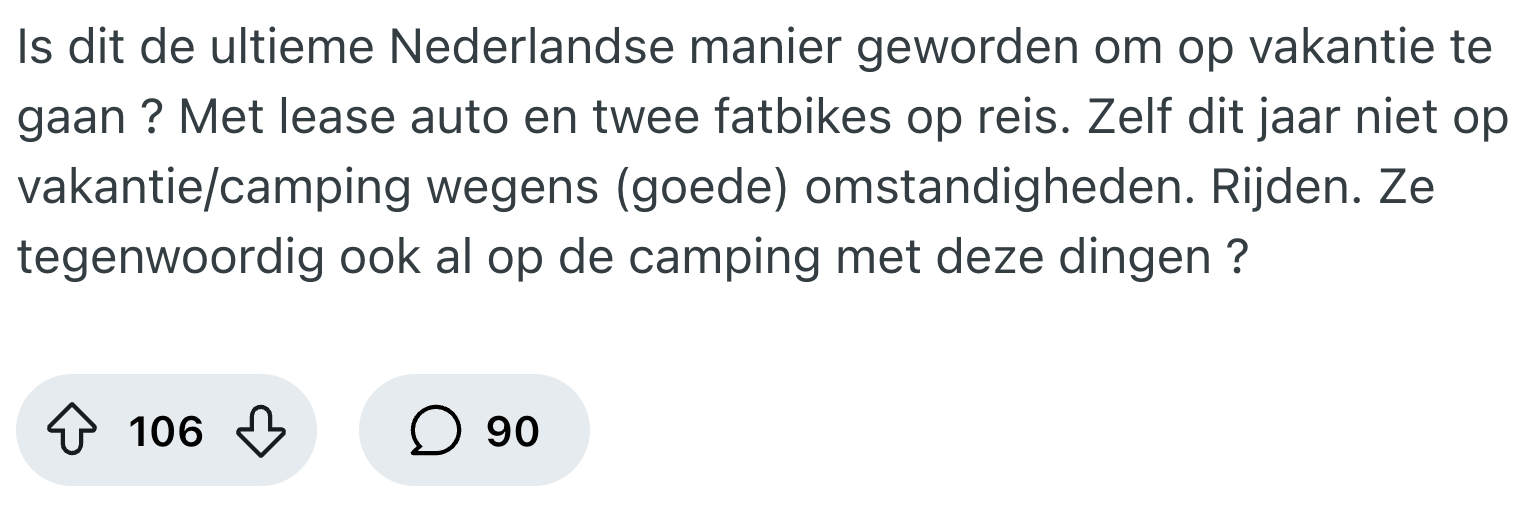 Op vakantie slepen veel gezinnen hun hele hebben en houwen mee. Stel je eens voor dat je het twee weken moet doen zonder je geliefde potjes pindakaas, of dat je onder een deken moet slapen die niet van jezelf is. Deze vakantiegangers stouwen niet alleen de auto vol, maar ook nog eens een aanhanger. Niet met campingstoeltjes en pakken hagelslag, maar met fatbikes. Een weggebruiker snapt niet waarom, en fietst die vraag er op Reddit effe in.