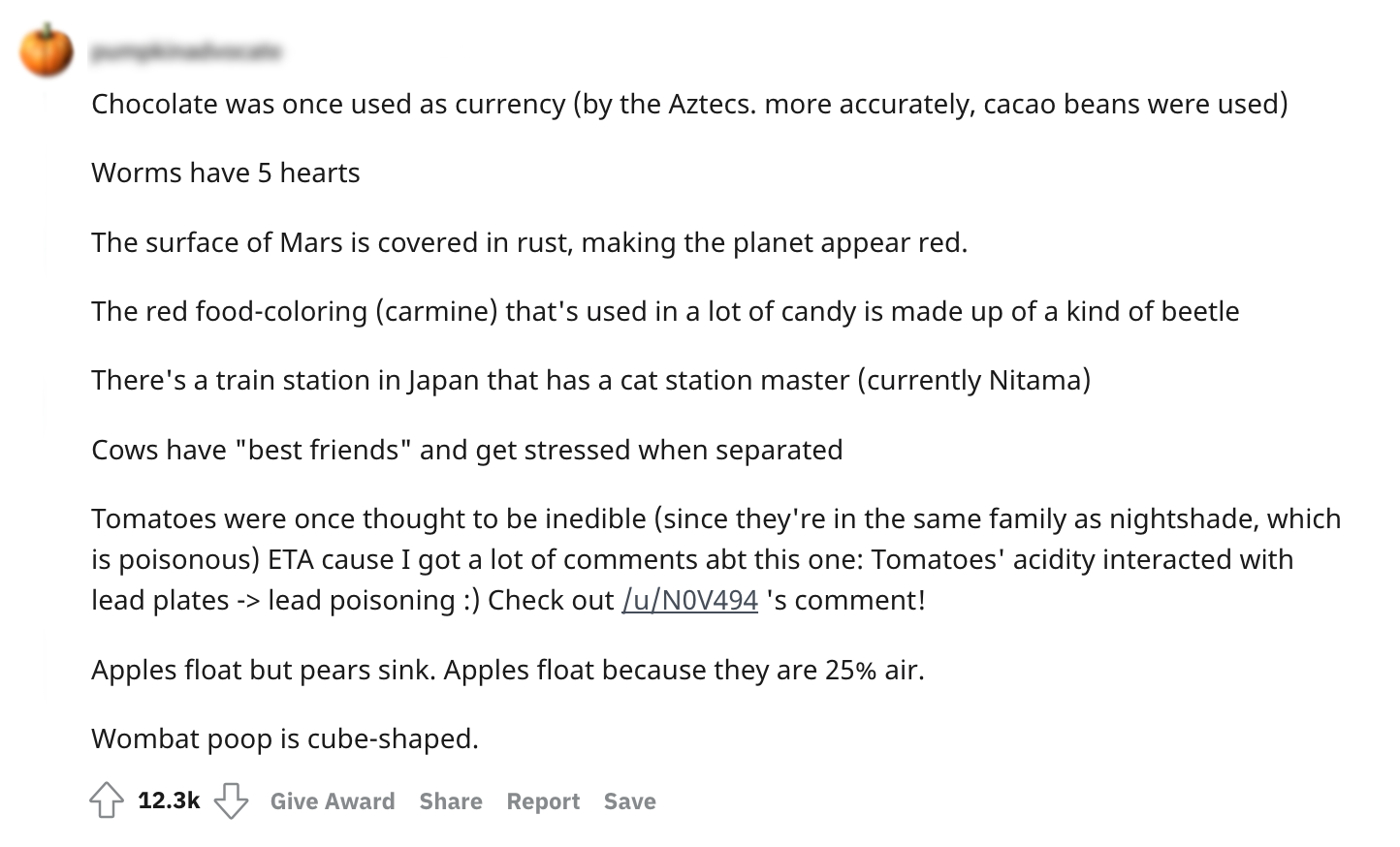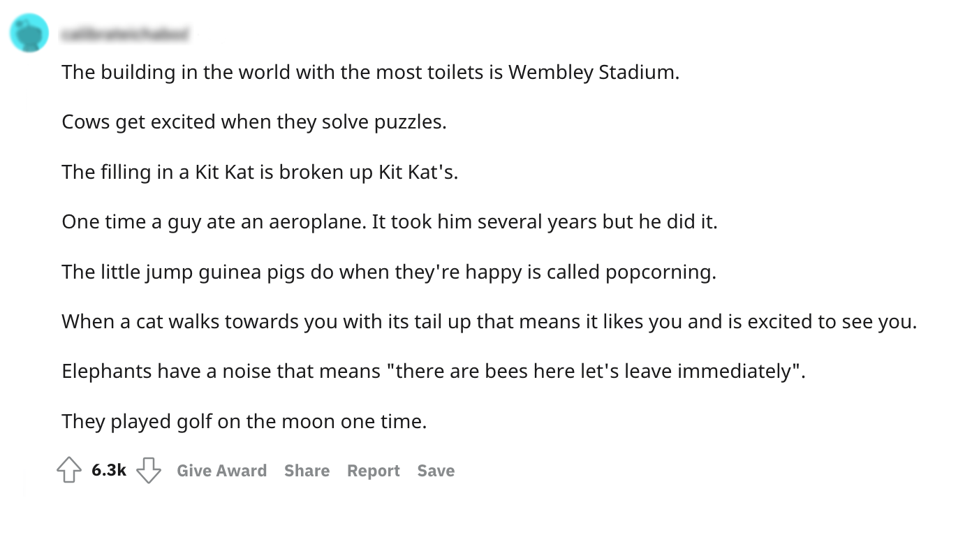 Wombats poepen vierkantjes, spinnen gebruiken kikkers als waakhond en er was ooit iemand die een vliegtuig heeft opgegeten. Het 4-jarige dochtertje van een zekere redditor valt niet in slaap zonder dit soort feitjes die je aan het denken zetten. Omdat de feitjes op begonnen te raken, schakelde hij de hulp in van de Reddit-community. De redditor vraag om niet al te moeilijke feitjes, maar wel zo goed dat het kind omver geblazen wordt. En dat is gelukt! Zelfs wij stonden een beetje te kijken van de weetjes.