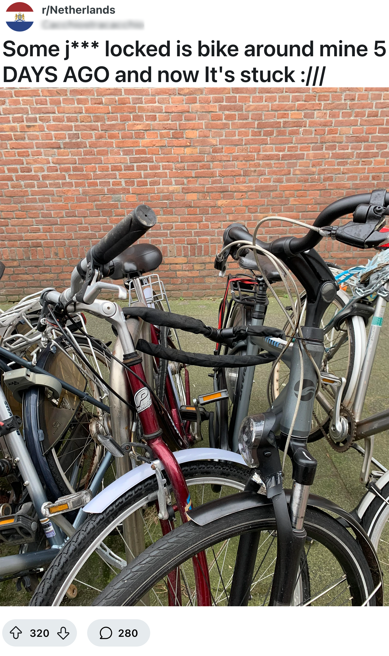 Nederland staat bekend als hét fietsland, en terecht: we hebben meer fietsen dan inwoners in ons kleine kikkerlandje. Maar het leven van een fietser gaat niet altijd over rozen. Van toeristen die het fietspad als wandelroute beschouwen tot de eindeloze zoektocht naar je fietssleutel: frustraties liggen altijd op de loer. Zo raakte déze Reddit-gebruiker verwikkeld in een vervelende situatie met z’n fiets waar diegene met geen mogelijkheid uit lijkt te komen…