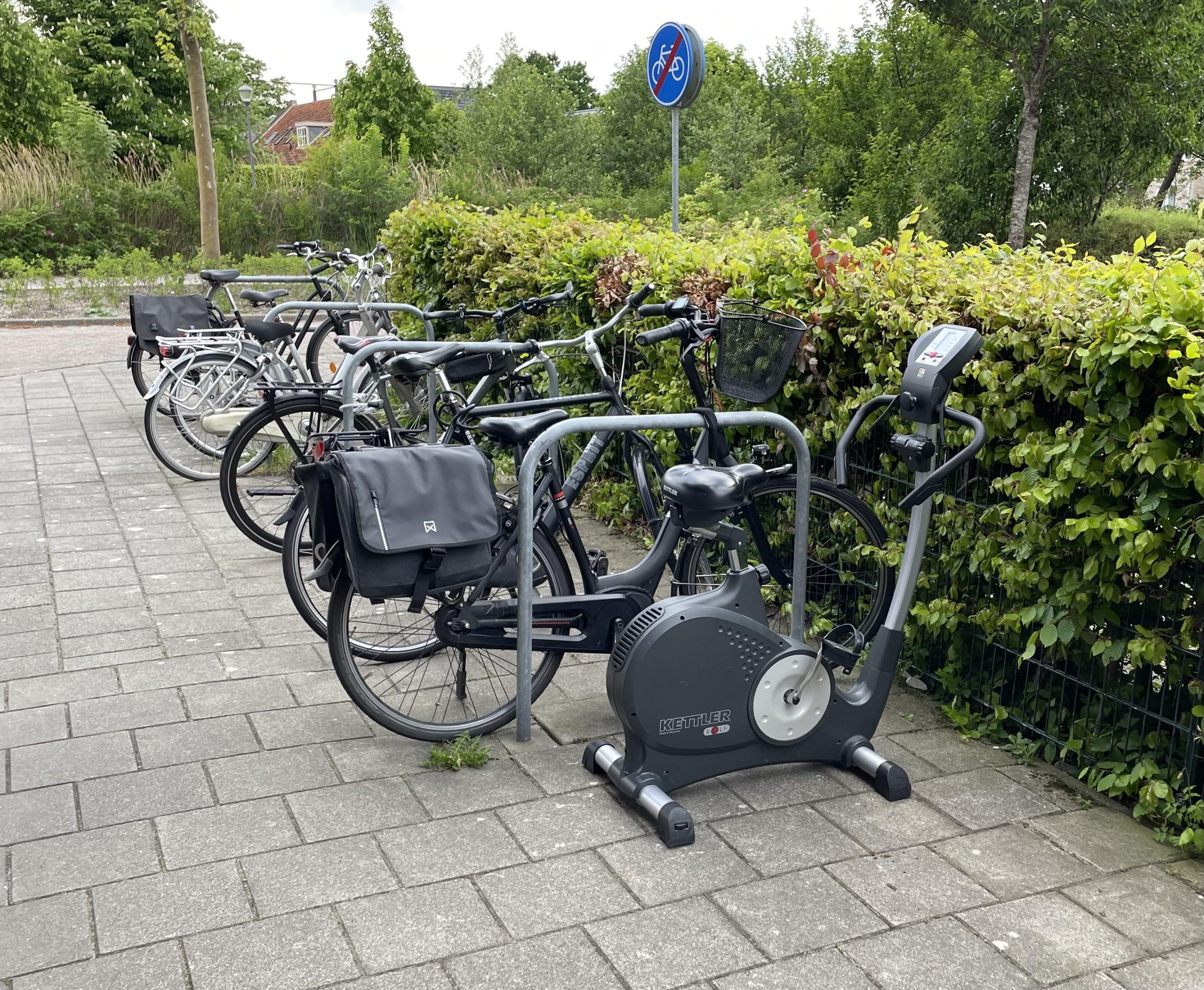 Als echte ‘gymrat’ ben je het liefst de hele dag door aan het sporten. Maar is dat realistisch? Niet echt. Je hebt immers ook andere verplichtingen, (veel) sportscholen sluiten op een gegeven moment hun deuren en je kunt je geliefde fitnessapparaten niet meesleuren naar je werk. Al lijkt het opmerkelijke ‘voertuig‘ dat in deze fietsenstalling staat, dat laatste probleem te ontkrachten…