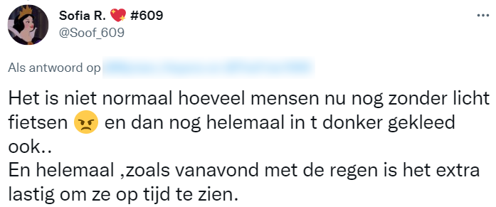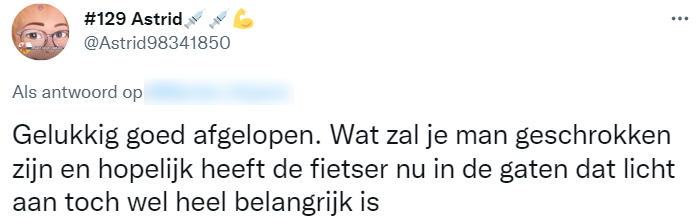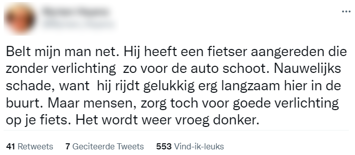 1. Ze vertelt het verhaal op Twitter, om zo anderen te waarschuwen voor de gevaren van fietsen zonder verlichting.