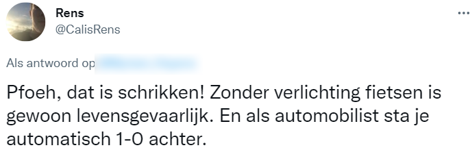 Het wordt vroeger donker en dit betekent dat het nóg belangrijker wordt dat we goed zichtbaar zijn voor andere weggebruikers. Werkende fietsverlichting is namelijk nog steeds niet heel vanzelfsprekend. Zo merkte ook deze twitteraar (die liever anoniem wil blijven omdat ze nog in onderhandeling is met de verzekering), toen haar man een fietser aanreed die zonder verlichting langsfietste.
