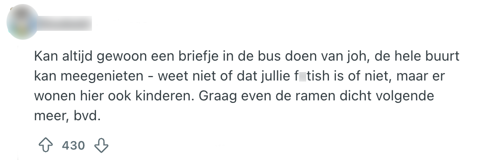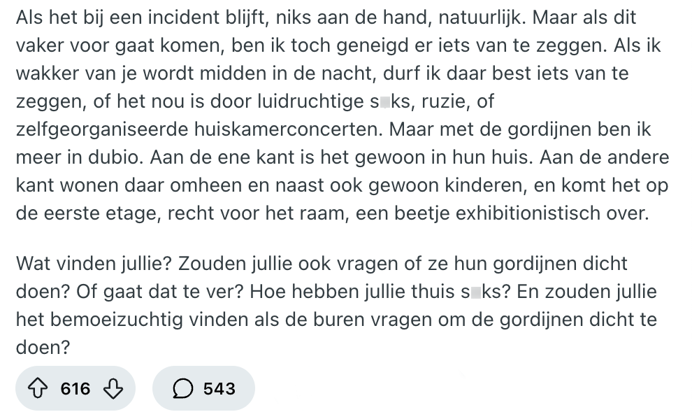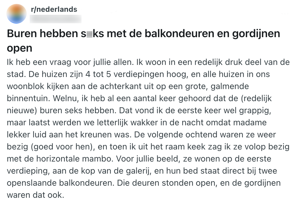 Het gras is altijd groener bij de buren. Het is een wat cliché uitspraak, maar dat maakt het niet minder waar. Jouw buren worden bijvoorbeeld niet lastiggevallen door de heftige ruzie in de buurtapp over de papiercontainer die vóór zes uur ’s avonds al langs de weg stond, want zij doen vrolijk mee. Ook deze flatbewoner had liever in de schoenen van de onderburen in kwestie gestaan, zodat-ie er zelf geen last van had. Diegene hoort namelijk al nachten en dagen op rij namelijk vreemde geluiden uit een woning komen. De balkondeuren en gordijnen staan wagenwijd open, en dat is niet het enige dat open staat. De flatbewoner schakelt de hulp van Reddit in, en anderen weten er wel raad mee.