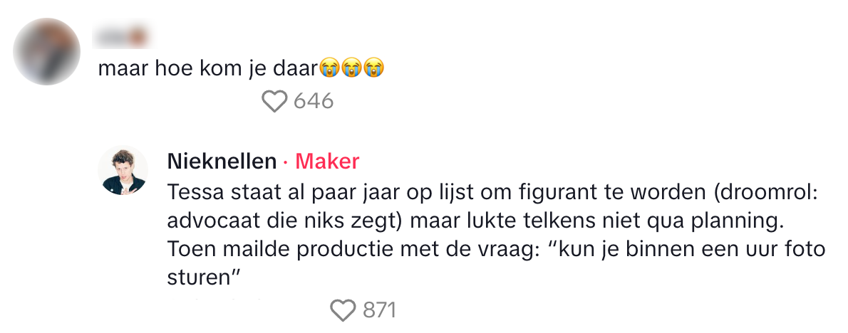 Je weet wat ze zeggen: het leven is een feest, maar je moet zelf de slingers ophangen. En precies daarom hebben de meesten van ons een bucketlist. Maar waar sommigen voor hun plezier vrijwillig uit een vliegtuig springen, blijven anderen liever met beide benen op de grond staan. Zo heeft Tessa één grote droom waar voor de verandering geen vliegtuig aan te pas komt. Ze wil namelijk ooit figureren in een bekende serie of film. En dat lukt, in Flikken Maastricht, maar de manier waarop blijft nog lang in haar geheugen gegrift.