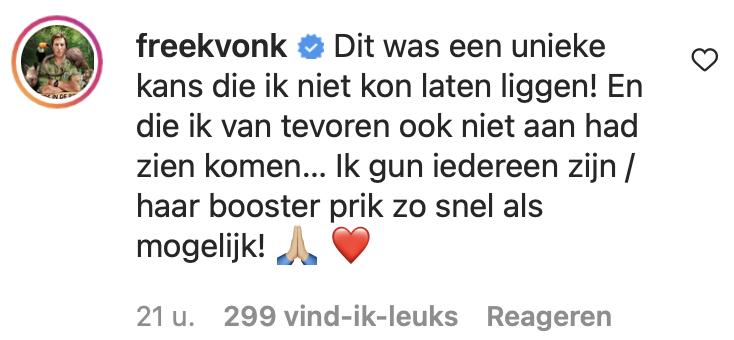 Na de vaccinatie tegen het coronavirus is er nu een boosterprik. Freek Vonk laat er geen gras over groeien en als hij onverwachts een boosterprik kan halen toont hij vrolijk een foto van de vaccinatie. Er zijn een hoop meningsverschillen over het vaccineren en dat blijkt ook wel weer onder de foto van Freek.