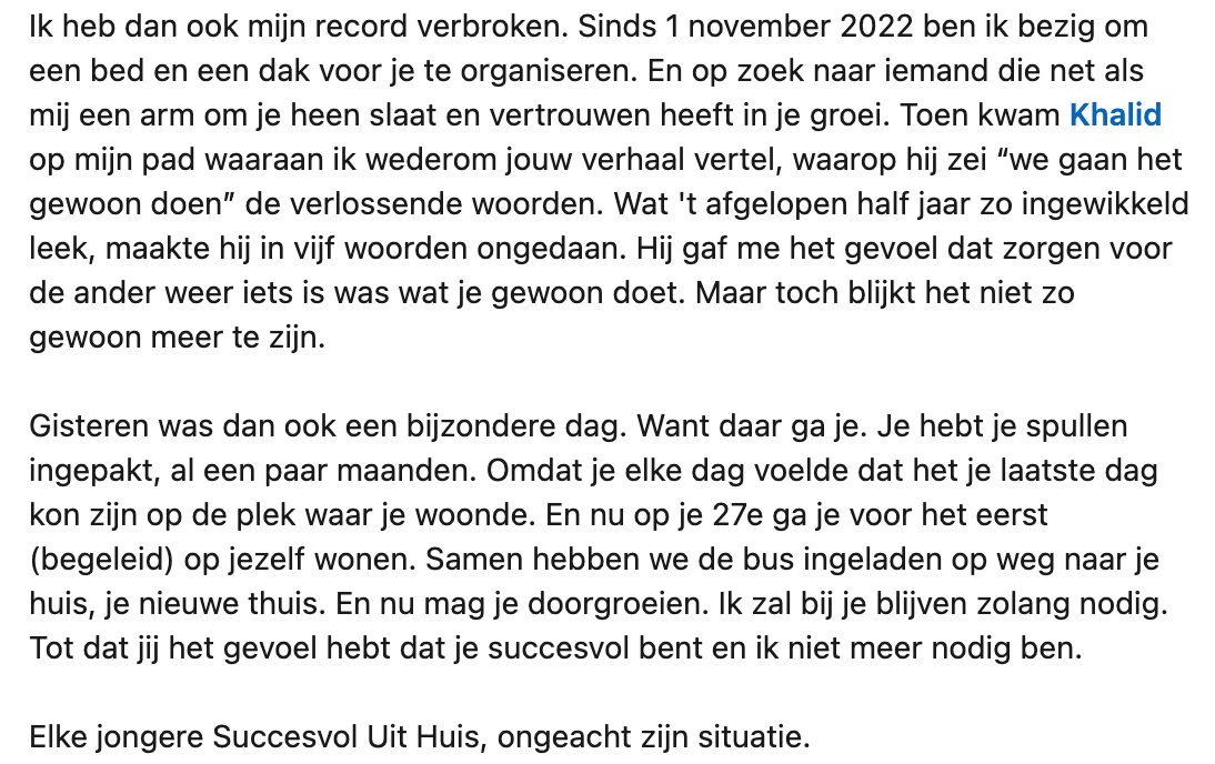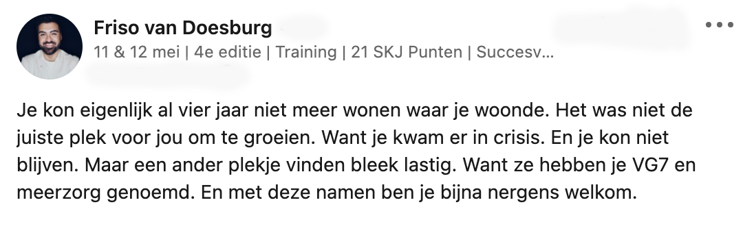 1. Friso vertelt op LinkedIn het verhaal van een verstandelijk beperkte jongen die geen nieuwe woning kon vinden, omdat hij bijna nergens welkom was.