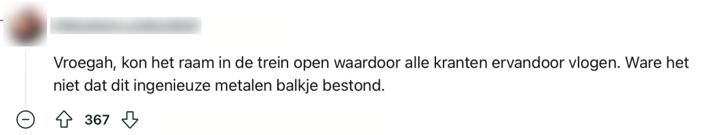 Reizen met de trein kan een zeer snelle en eenvoudige manier zijn om van A naar B te komen, maar de rit loopt helaas niet altijd op rolletjes. Zelfs als de NS alles op de rails heeft, zitten er weer een aantal reizigers in je coupé die totaal niet sporen. De één belt met zijn ex om even alle relatieperikelen te bespreken, terwijl de ander naast je zijn gore teennagels zit te knippen. Bij sommige mensen zit er nogal een defect in de bovenleiding. Deze Reddit-gebruiker zit wél van zijn treinreis te genieten, maar vraagt zich plots af waar dit metalen onderdeel toch voor dient. En de mensen in de comments worden hierdoor helemaal loco.