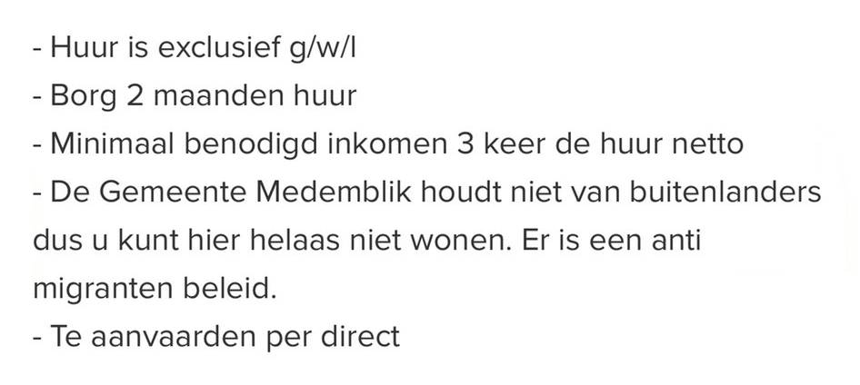 – De Gemeente Medemblik houdt niet van buitenlanders dus u kunt hier helaas niet wonen. Er is een anti migranten beleid. https://t.co/iLYAAnM8kB
