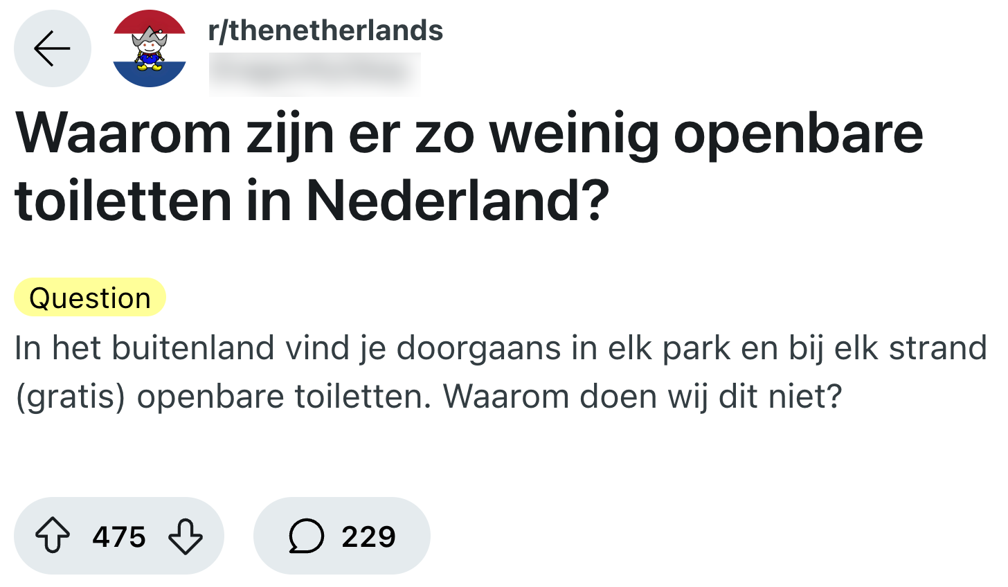 Je bent onderweg, op stap of de hele dag buiten bezig, en ineens voel je het: je moet naar de wc. En dan? Lang niet overal in Nederland zijn openbare toiletten te vinden, dus je komt mogelijk in een benarde situatie terecht. Op Reddit kaart iemand dit probleem aan, en dat blijkt voer voor een hoognodige discussie te zijn