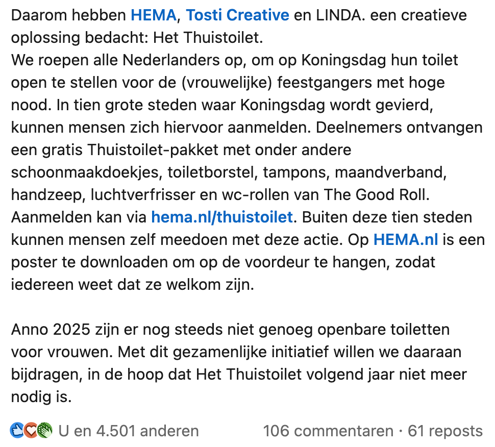 Dé dag waarop de straten oranje kleuren, boten uit de loodsen worden gehaald en daydrinking ineens sociaal geaccepteerd is, staat weer voor de deur: de verjaardag van onze Wim-Lex. Al vieren we het dit jaar een dagje eerder dan normaal – want ja, op de dag van de Heer mag je natuurlijk niet je kop eraf zuipen. En nu we het toch over drank hebben: een paar wijntjes of biertjes zetten je blaas op scherp. En dát is een probleem, want aan openbare toiletten is op Koningsdag nog altijd een groot tekort. Daarom bundelen HEMA, LINDA. & Tosti Creative hun krachten en maken zij zich hard voor een hoognodig initiatief: het Thuistoilet.