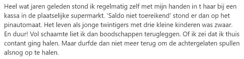 2. Ze herkent zich in de vrouw. Vroeger had ze het zelf niet breed en had ze regelmatig geen saldo.