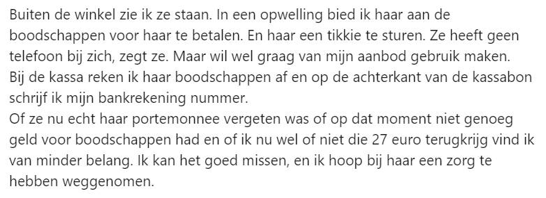 14. Annemarie wil de vrouw in kwestie niet in een ongemakkelijke positie plaatsen door al deze liefdadigheid. Wel doet ze iets anders met alle berichten: samen roepen Annemarie en haar nieuwe netwerk de hashtag #27euro in het leven. Iedereen die het kleine bedrag kan missen om iets moois voor een ander te doen is meer dan welkom om zich aan te sluiten. Mooi toch?