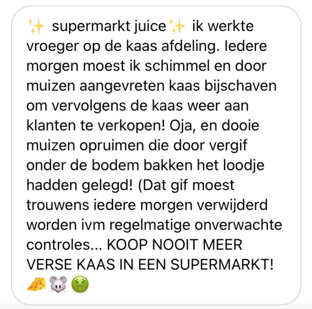 Soms zie je dingen in de supermarkt die je eigenlijk echt niet wil zien. Of dit nu gekke producten zijn, bijzondere mensen of ongedierte. Jullie deelden de gekste ervaringen in de supermarkt met ons. Klein tipje: zorg dat je niet net aan het eten bent of naar de supermarkt moet, dat is na het lezen van deze reacties namelijk net wat minder lekker.
