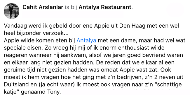 Iedere winkel of restaurant-medewerker zegt het: klant is koning. Cahit is eigenaar van een kebab-tent, en gaat wel heel ver voor zijn gasten. Hij kreeg een heel opvallend verzoek van ene Appie, speelde helemaal mee met de gast en werd uiteindelijk zelf de dupe. Een opvallend verhaal wat vast nog wel een vervolg krijgt.