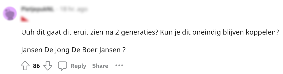 Sinds gisteren kan je als ouder kiezen welke achternaam je pasgeboren kind gaat dragen. Zo kan je nu bijvoorbeeld voor de achternamen van beide ouders gaan én mag je ook nog eens zelf de volgorde bepalen. Deze mensen op Reddit zagen hier de lol wel van in en kwamen met geniale achternaam combinaties.