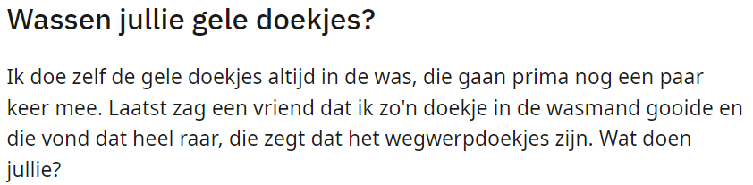 Steeds meer mensen gaan duurzamer met de wereld om door hun spullen te hergebruiken. Maar tot in hoeverre zijn mensen bereid om te recyclen? Deze Reddit-gebruiker windt er geen doekjes om en stelde de vraag of mensen hun gele doekjes wassen of simpelweg weggooien. Dit heeft een ‘interessante’ discussie als gevolg.