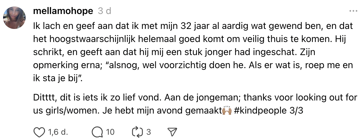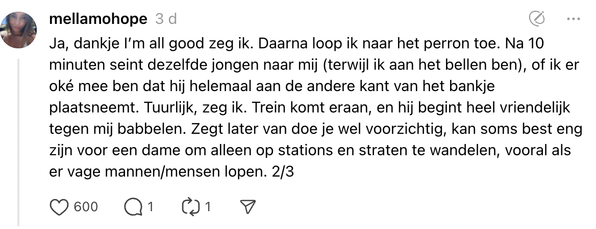 Voor sommige reizigers kan het als een uitdaging voelen om in de late uurtjes op het station te staan – vooral als ze ooit eerder zijn lastiggevallen. Azja heeft hier niet veel last van, maar toch wil een negentienjarige medereiziger haar een veilig gevoel geven. Hij spreekt haar aan en maakt daarmee een diepe indruk.