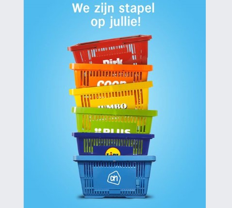 De boodschap ‘liefde voor iedereen’ op een prachtige manier tot uiting gebracht door gebruik te maken van de mandjes van de concurrenten.