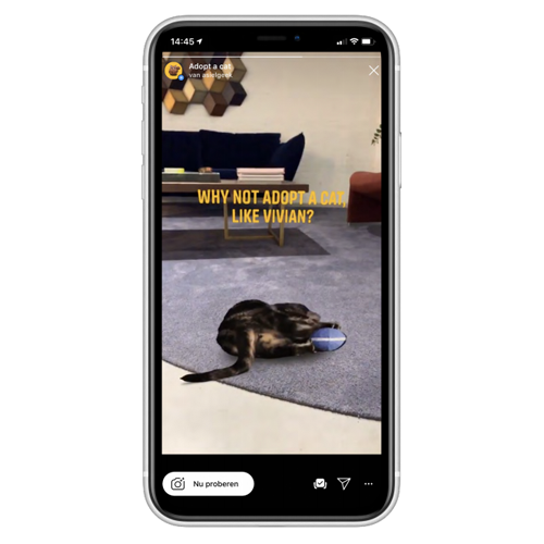Asielkat Vivian werd gefilmd voor een green screen en kan nu digitaal in elk thuis verschijnen. De perfecte manier om mensen ervan te overtuigen om een asieldier te kopen.