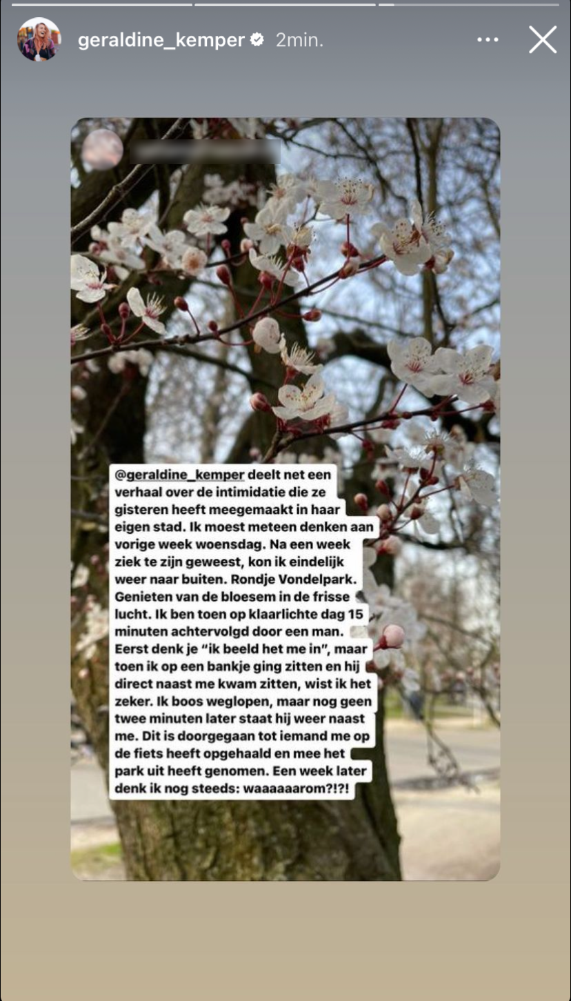 In Nederland is het helaas nog steeds zo dat vrouwen regelmatig worden lastig gevallen op straat. Of het nu gaat om een vervelende opmerking, een nare achtervolging of in sommige gevallen zelfs nog erger. Het is daarom belangrijk dat vrouwen zich hierover uit blijven spreken. Geraldine geeft het goede voorbeeld en deelt in haar Instagram-story een vervelende ervaring. Toen ze gisteren over straat liep, werd ze tot twee keer toe lastiggevallen. Gelukkig krijgt ze veel steun van andere vrouwen.