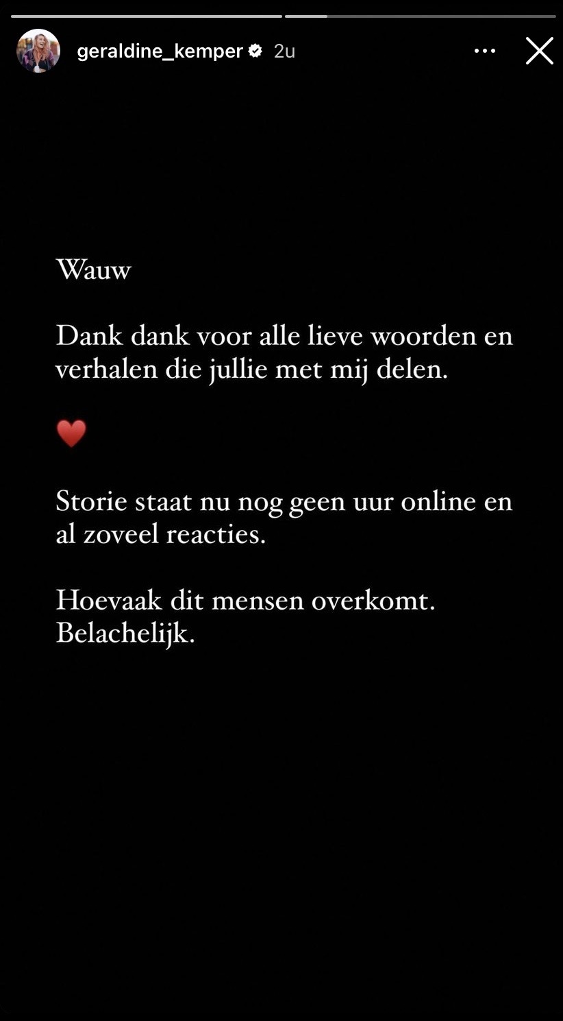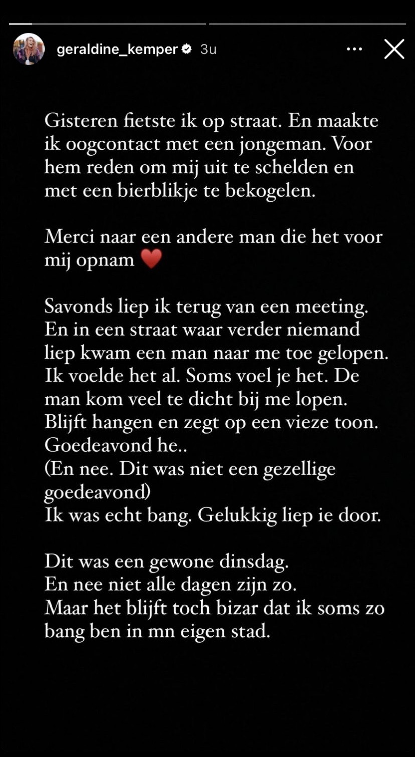 In Nederland is het helaas nog steeds zo dat vrouwen regelmatig worden lastig gevallen op straat. Of het nu gaat om een vervelende opmerking, een nare achtervolging of in sommige gevallen zelfs nog erger. Het is daarom belangrijk dat vrouwen zich hierover uit blijven spreken. Geraldine geeft het goede voorbeeld en deelt in haar Instagram-story een vervelende ervaring. Toen ze gisteren over straat liep, werd ze tot twee keer toe lastiggevallen. Gelukkig krijgt ze veel steun van andere vrouwen.