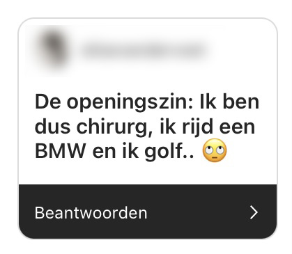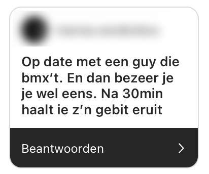 Daten, de één zit elk weekend met een nieuwe date aan de gracht, terwijl de ander liever op de bank blijft swipen op Tinder. Naar aanleiding van Lia’s tweet deelden wij in onze Instagram story een sticker met het onderwerp: deel jullie ergste gesprek of gesprekspartner op een date. Door deze antwoorden begrijpen wij dat je liever thuis blijft.