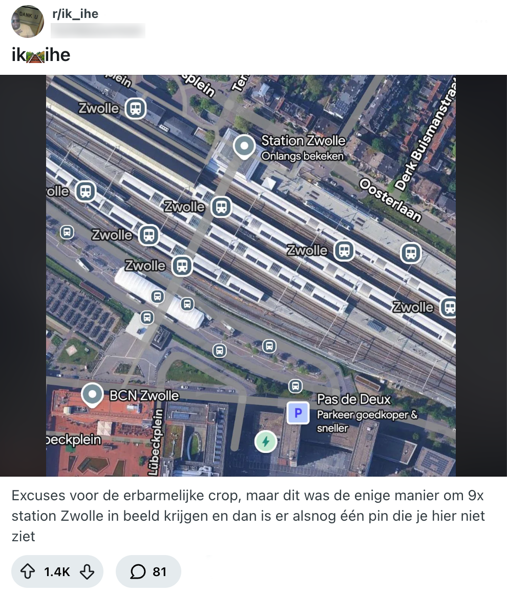 Op het station kun je vrijwel onmogelijk verdwalen. Overal hangen bordjes met aanwijzingen, dus je moet wel heel erg je best doen om op de verkeerde plek uit te komen. Toch krijgt Google Maps het voor elkaar om reizigers van hun stuk te brengen. Deze gebruiker spot namelijk een opvallend detail over station Zwolle op de kaart en is het spoor bijster.