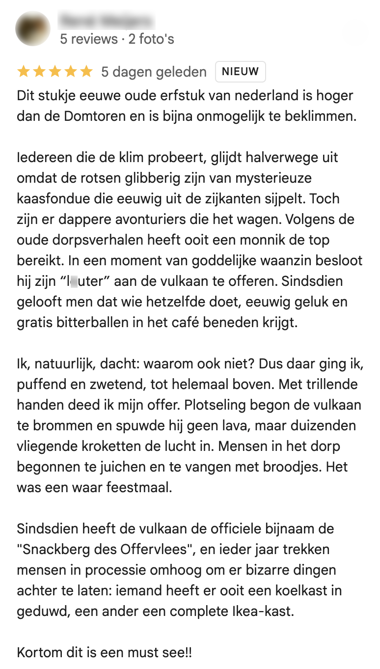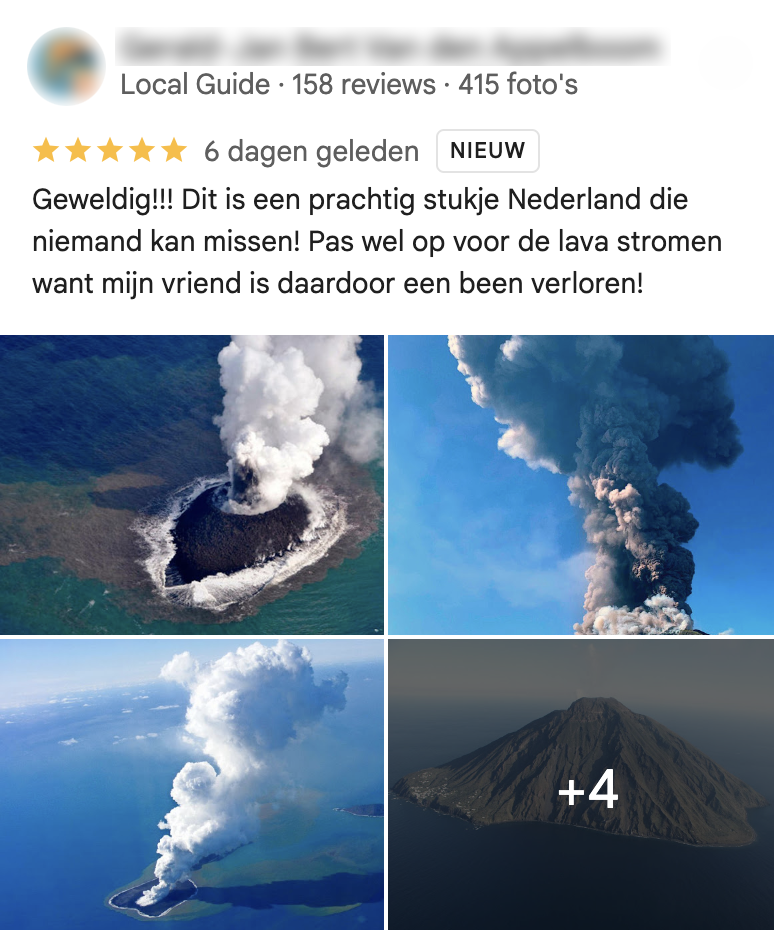 Wist je dat er diep in de Waddenzee een eeuwenoude vulkaan ligt? Waarschijnlijk niet, maar hij is toch echt te vinden op Google Maps. Nederlanders zijn on fire en laten massaal de meest bizarre reviews – inclusief AI-beeldmateriaal – achter over deze Zuidwalvulkaan. En dat allemaal om jou wijs te maken dat-ie daadwerkelijk vuur spuwt. Kijk, lees en geniet.