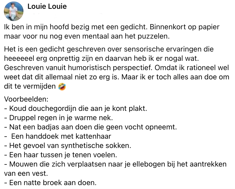 1. Louie wil graag een gedicht schrijven over sensorische ervaringen die niet echt prettig zijn. Er worden al een aantal grappige voorbeelden gegeven.