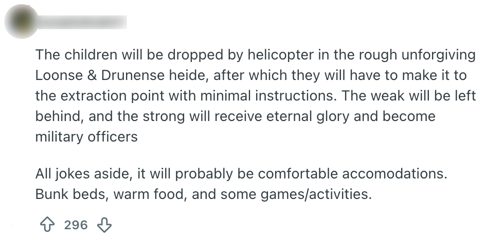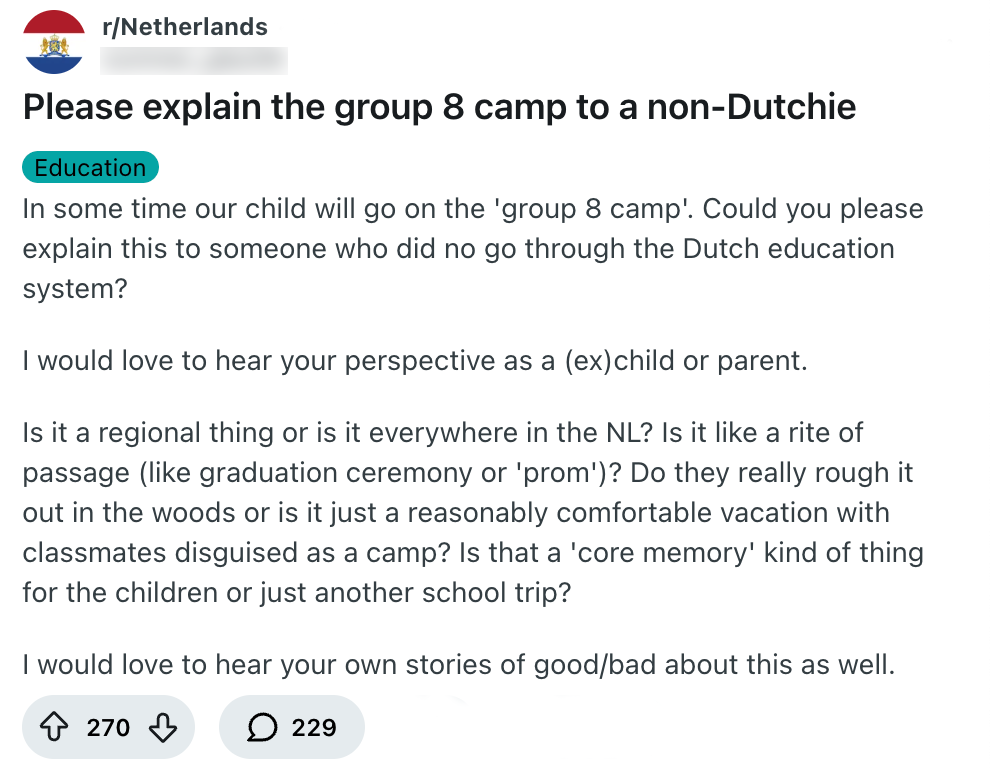 Groep 8 is het meest bewogen jaar van je basisschooltijd. Je wil een goede score halen op je doorstroomtoets, onwijs je best doen om de hoofdrol in de eindmusical te krijgen en (voor sommigen het hoogtepunt van het jaar) op kamp gaan. Voor ons is het de normaalste zaak van de wereld dat je een paar dagen met je klasgenoten een afgelegen oord op stelt gaat zetten, maar dat is niet voor iedereen zo. Een expat op Reddit is benieuwd naar het groep 8-kamp en vraagt Nederlanders naar hun ervaringen. De reacties zetten het uitje alleen niet bepaald in een goed daglicht.