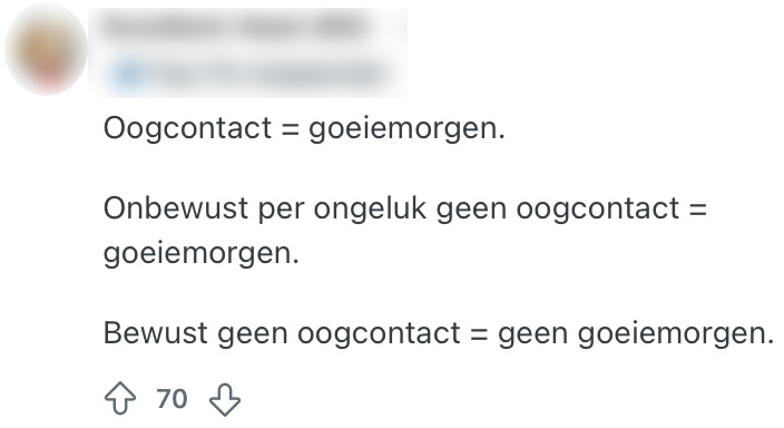 Zeg jij ‘goedemorgen’ als je iemand tegenkomt op straat of in de lift? Of loop je gewoon door zonder iets te zeggen? Voor de één is het een kleine moeite en een teken van beleefdheid, terwijl de ander er niet aan moet denken. Het hangt natuurlijk ook af van hoeveel mensen je per dag tegenkomt, je kan niet altijd iedereen één voor één groeten. Een Reddit-gebruiker vroeg zich af hoe het tegenwoordig zit met het groeten van onbekenden.