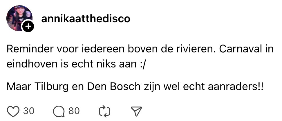 1. Ter vergelijking: werken op de vrijdag van carnaval is voor Brabanders net zo pijnlijk als werken op de donderdag voor Lowlands voor Randstedelingen.
