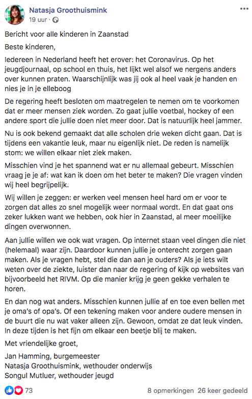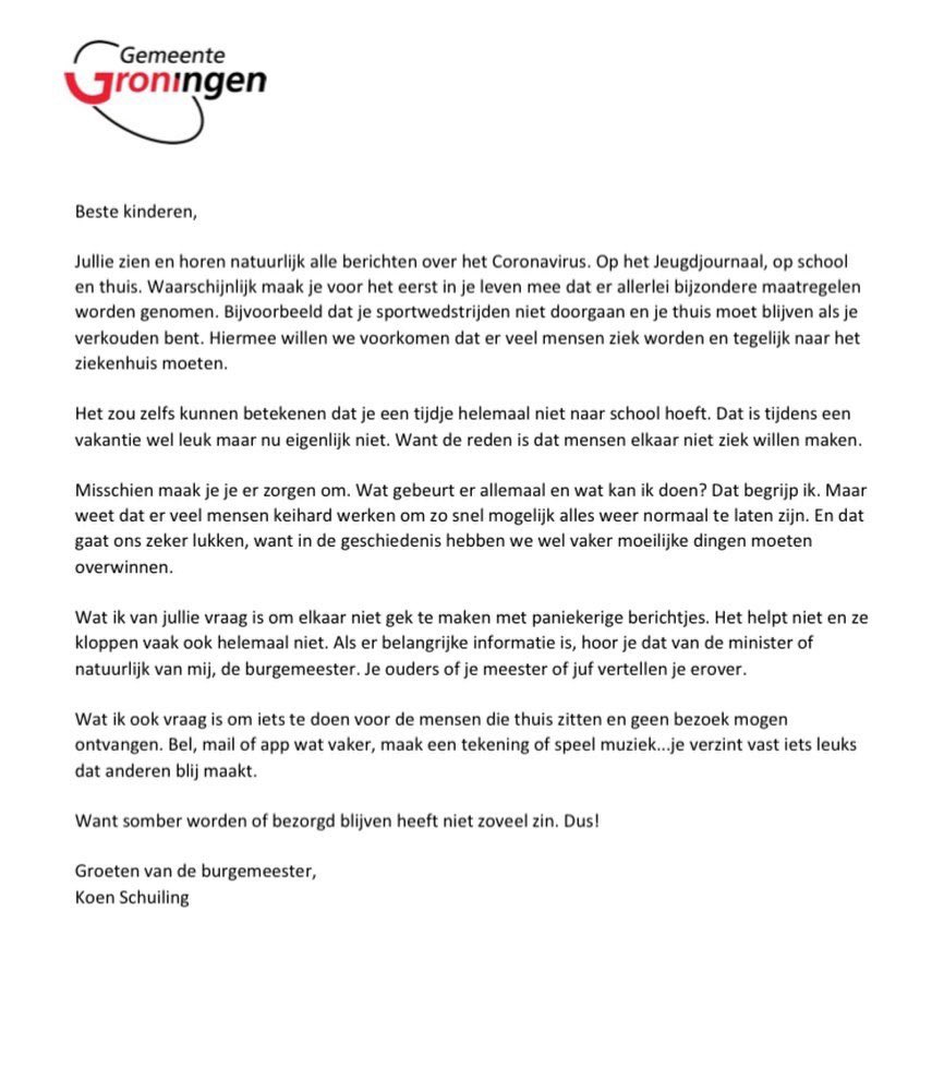Nu scholen en sportclubs dicht zijn, verandert er ook een hoop voor kinderen. Op het Jeugdjournaal worden ze natuurlijk dagelijks ingelicht, maar Koen Schuiling, de burgemeester van Groningen wilde de jonge bewoners van zijn stad graag nog wat extra informatie geven, geruststellen en op ideeën brengen en schreef ze een mooie brief.