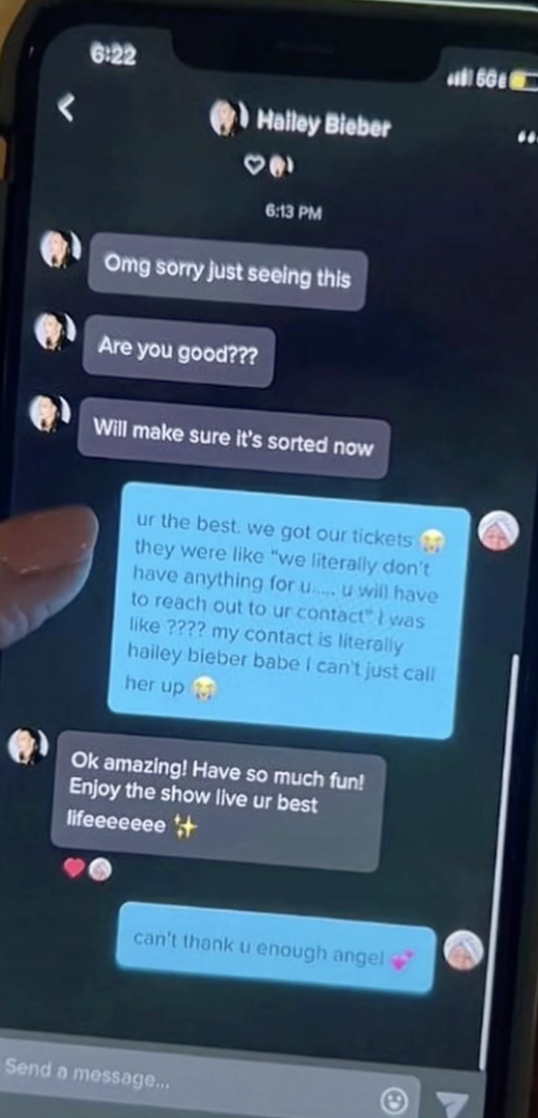 2. Dit was de reactie van Hailey Bieber waardoor Lacy ineens toch naar het concert kon met haar vriendin. En als Hailey Bieber je een bericht probeert te sturen, dan reageer je daar natuurlijk op. Wel zo netjes.