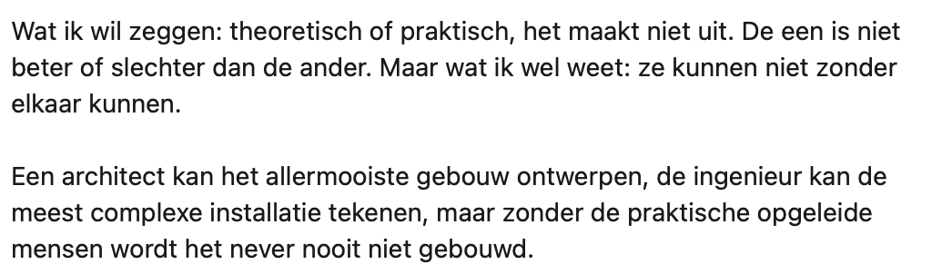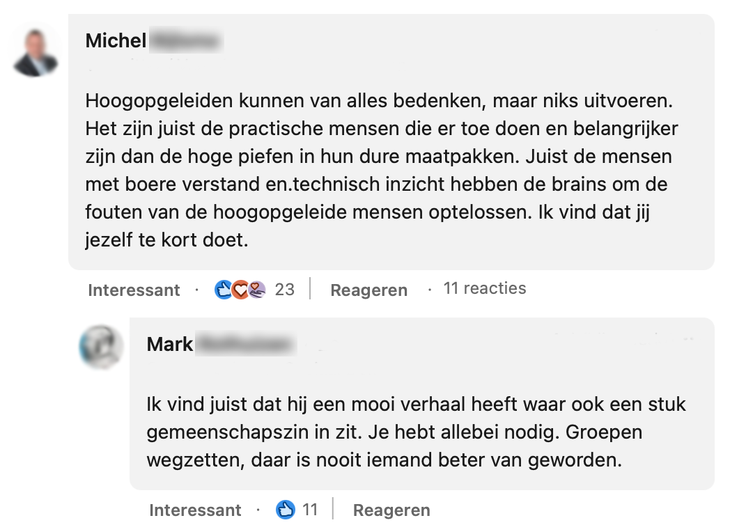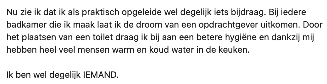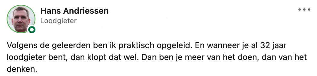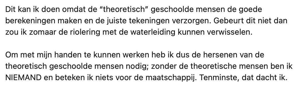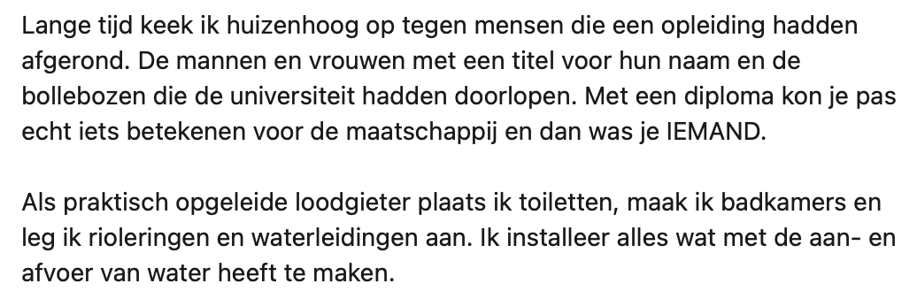 Er zit een groot verschil in praktisch en theoretisch opgeleid worden. Hans is loodgieter en dus praktisch opgeleid. Hij deelt dat hij zich vroeger altijd ‘minder’ voelde. Hans had het idee dat als je een diploma van een universiteit op zak had, je pas echt ‘iemand’ was. Inmiddels weet hij gelukkig wel beter en legt hij precies uit waarom hier niets van waar is.