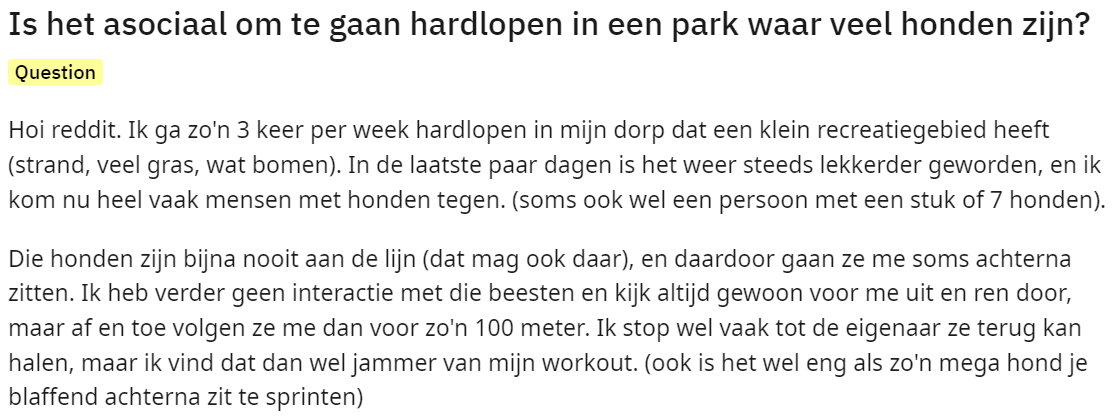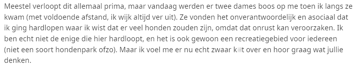Een rondje hardlopen in een klein recreatiegebied pakte voor de volgende hardloper niet zo goed uit. Tijdens zijn wekelijkse rondje vielen er twee dames tegen hem uit omdat hij te dicht bij hun honden zou lopen. Na deze vreemde interactie besluit hij de situatie op Reddit uit te leggen en vraagt hij anderen om hun mening.